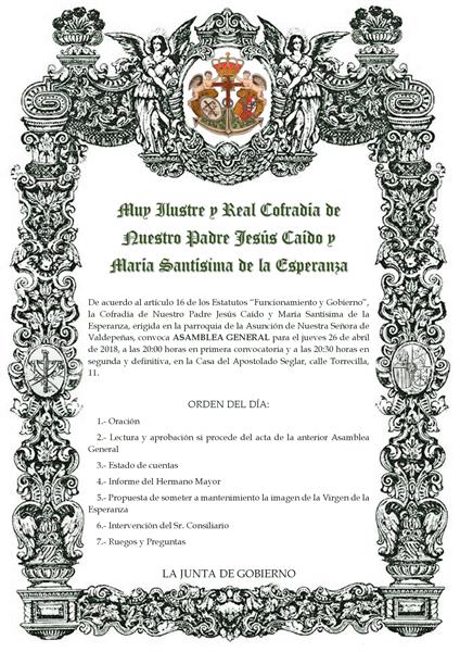 De acuerdo al artículo 16 de los Estatutos “Funcionamiento y Gobierno”, la Cofradía de Nuestro Padre Jesús Caído y María Santísima de la Esperanza, erigida en la parroquia de la Asunción de Nuestra Señora de Valdepeñas, convoca ASAMBLEA GENERAL para el jueves 26 de abril de 2018, a las 20:00 horas en primera convocatoria y a las 20:30 horas en segunda y definitiva, en la Casa del Apostolado Seglar, calle Torrecilla, 11.