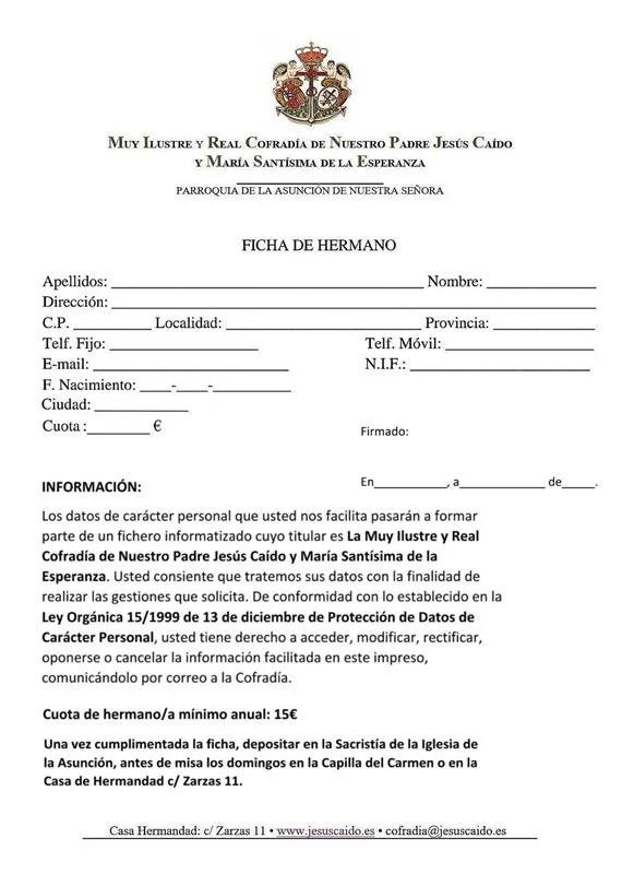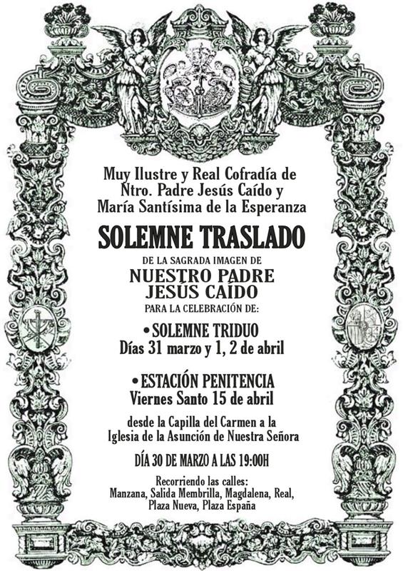 El próximo miércoles 30 de marzo a las 19:00h (D.m.), la imagen de Nuestro Padre Jesús Caído. será trasladada desde la Capilla del Carmen hasta nuestra sede canónica, la Iglesia Parroquial de la Asunción de Nuestra Señora, para la celebración de su Solemne Triduo, y posterior Estación de Penitencia.